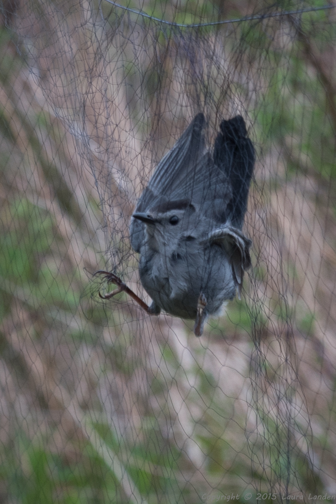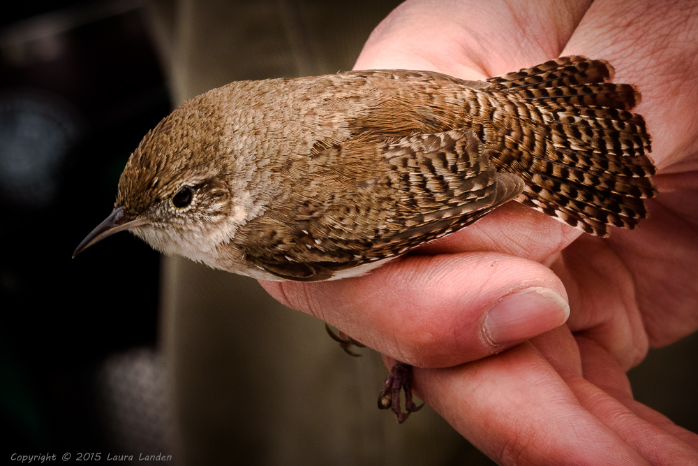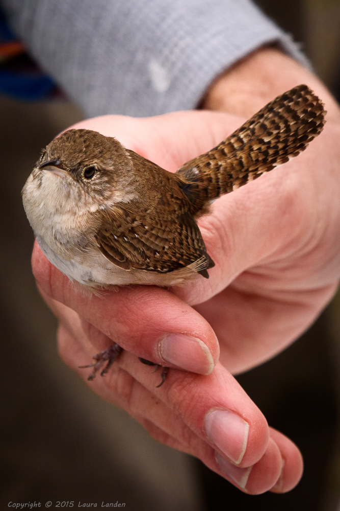 Once a bird flies into the net it must be released with care. The rest position for a songbird’s foot is to have the toes closed, so that’s the first thing to do–free the feet. Then, ever so gently, Charlie works the bird out of the net, one hole at a time. Once freed, the bird is banded, with a careful notation of the species and the band number. Then several measurements are taken–the length of the tarsus, the culmen, the wing, and the tail. Finally, the bird is weighed, sexed, and aged, and then released. Care must be taken with territorial birds to release them in the same location where they were netted. Nothing worse for a male house wren defending a territory than to be released into another male’s territory!