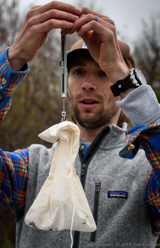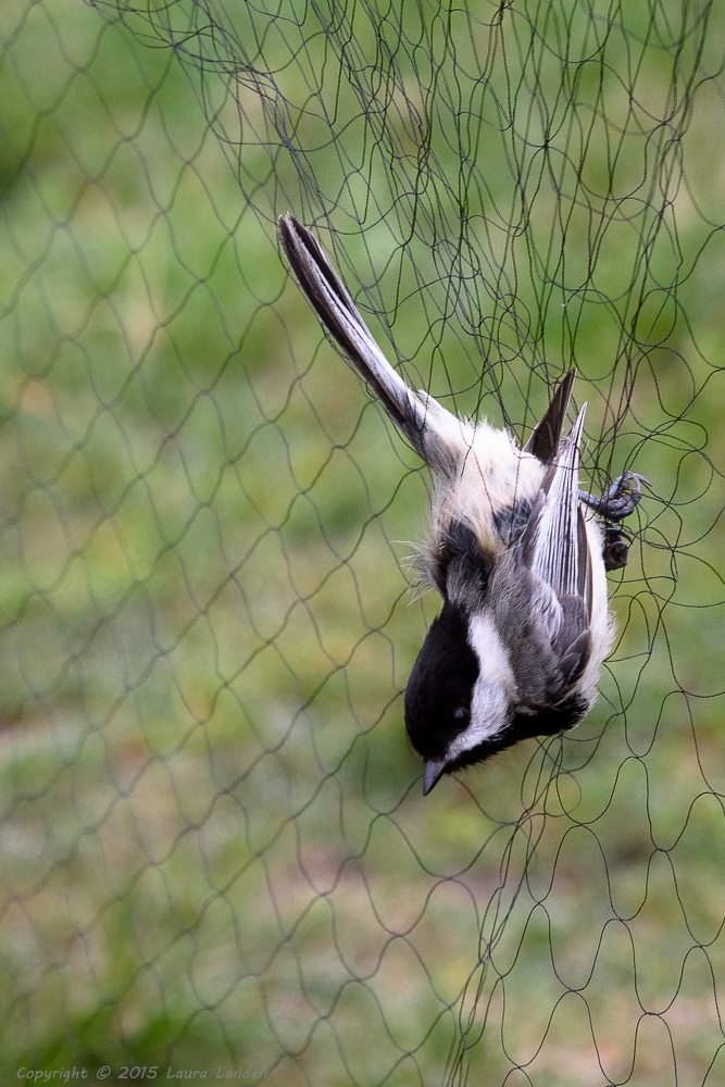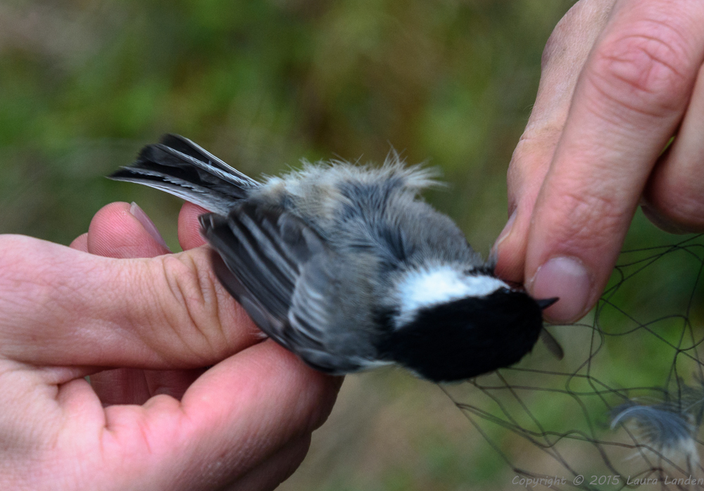 Birds vary in their reaction to being netted. Some take it better than others. The catbirds were all rather calm, but the towhee was definitely not pleased! The chickadee repaid Charlie’s gentle release efforts with a nip on the finger. Little bird, but with a beak made for cracking seeds! Some things were interesting about the data. The catbirds all weighed the same as catbirds netted last fall. The little chickadee weighed a mere 10 grams, but the apparently larger house wren weighed in two grams lighter. Did you know that the total weight of a bird’s feathers is more than the weight of the skeleton?