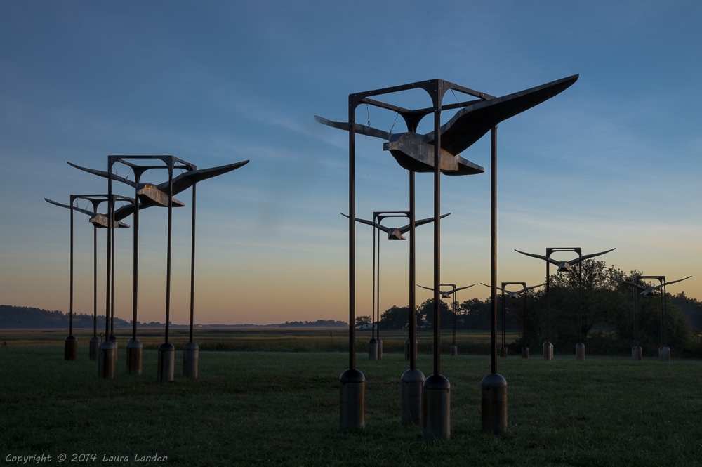 Our photo workshop on Cape Ann included a sunrise stop on day two and a walk around the harbor on the final day. In this gallery you’ll find the sun rising over the marsh and highlighting an unusual sculpture installation called “Flight.” Harbor highlights include the waiting umbrellas at a local restaurant, “Latitude 43” and some other colorful items.